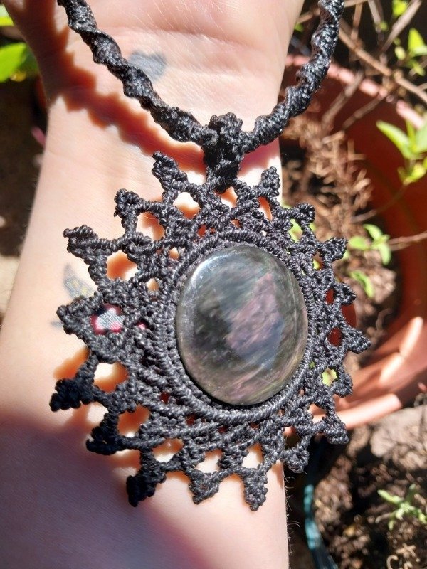 Mándala tejido en macrame, con hilo encerado calidad premiun.En el centro lleva engarzada una Obsidiana Manto Huichol origen: Mexico.